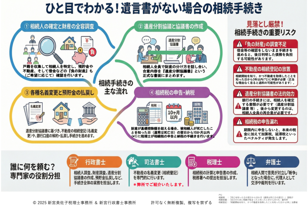 - 必要に応じて 遺産分割協議 → 遺産分割協議書の作成